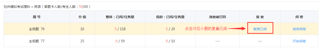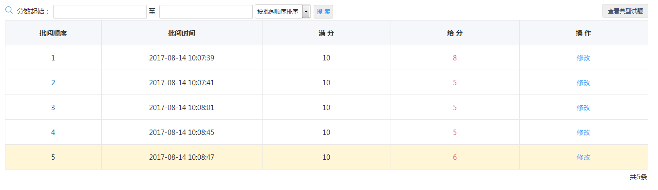 2.教师可以通过输入起始分数范围,或者选择试卷给分调整已阅试卷的排列顺序,方便进行复查试卷,点击“修改”进入相应的复查页面,复查页面同阅卷页面。同时也可点击右上角的“查看典型试题“按钮来查看自己标记过的试题。